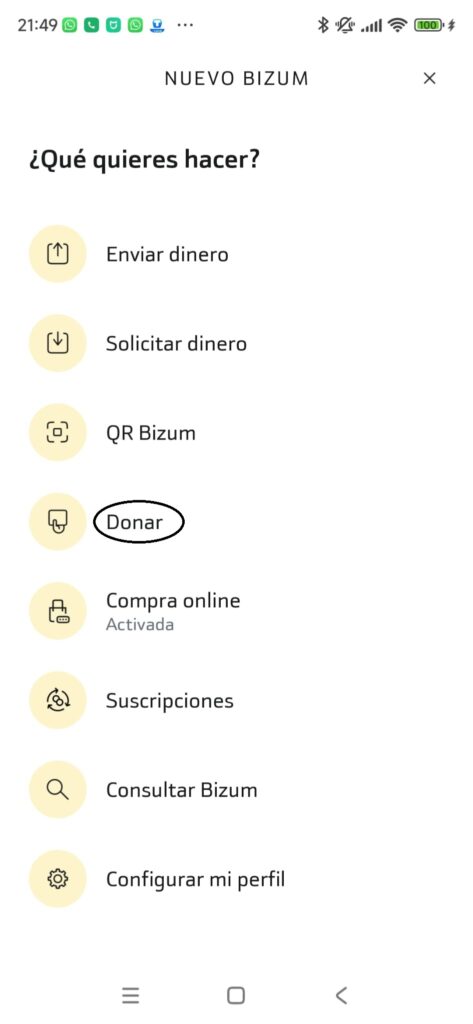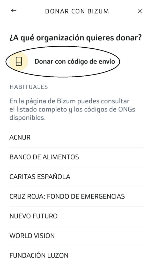 - en tu aplicación de tu banco, en vez de enviar a un contacto elige «»enviar a «donar» (puede variar en función de la app de tu banco)
